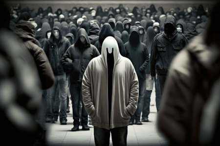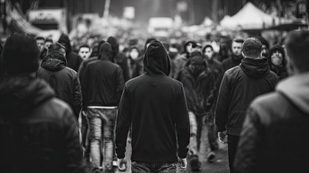 A grayscale image depicts a dense crowd with one individual clearly centered and in focus. The person, hooded, is the subject with other people appearing blurred around. The lighting seems natural. Ideal for illustrating themes of individuality, contrast, or representing complex social dynamics. Suitable for various editorial and commercial applications.
