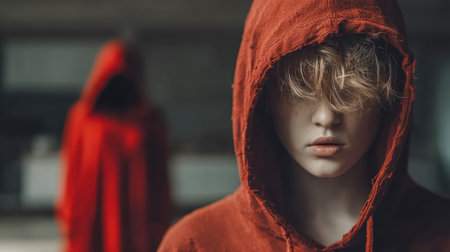 Young individual wearing a red hoodie stands in focus, with a shadowy figure in a similar outfit blurred in the background, creating an intriguing atmosphere.
