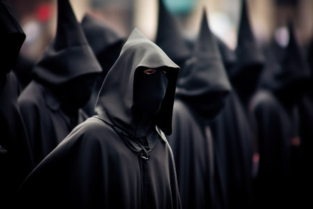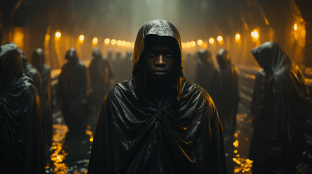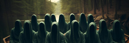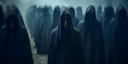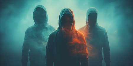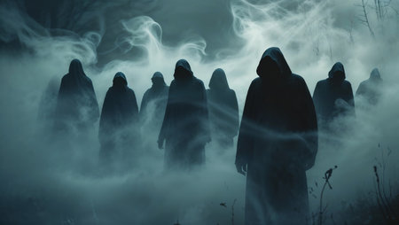Mysterious hooded figures walking through fog create an eerie and haunting atmosphere. Ai generated image