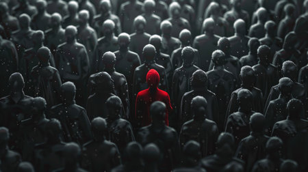 Concept of individuality with a crowd of gray silhouettes and one red figure standing out, highlighting uniqueness and leadership