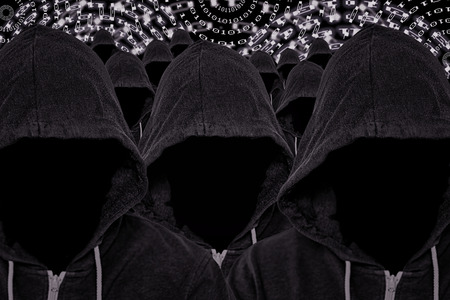 Multitude of hooded unknown mysterious computer criminals with binary code background