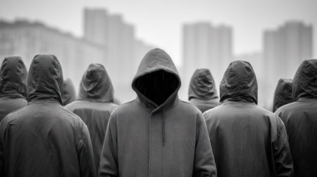 A grayscale image depicts a crowd of people walking, with a focus on figures in hoodies. The composition uses a shallow depth of field, emphasizing the texture of clothing. The lighting appears diffused, suggesting an overcast day. This image could be used for editorial content or illustrate themes of anonymity.