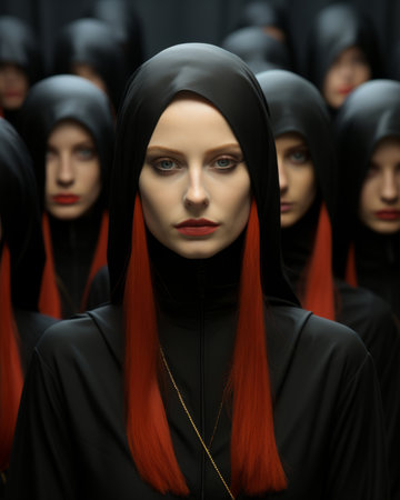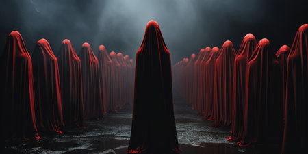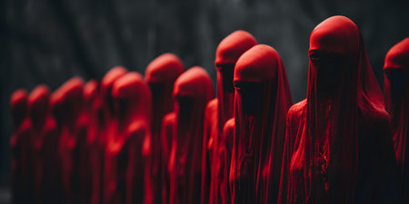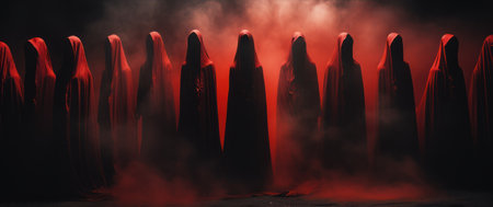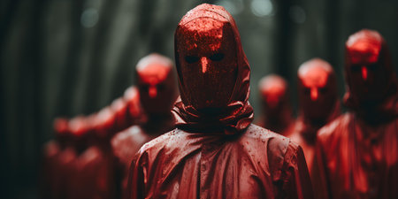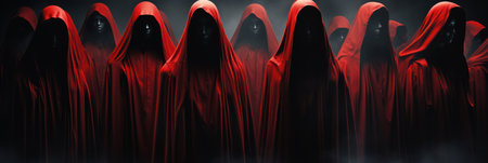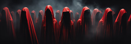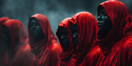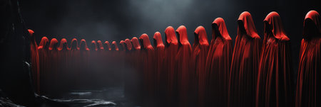A mesmerizing scene of people in vibrant red cloaks with hoods, gathered in a mysterious and enigmatic setting. The dramatic atmosphere, rich in symbolism, evokes a sense of secrecy and intrigue