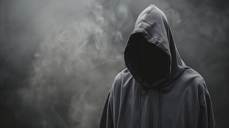 An enigmatic figure shrouded in a hood stands amidst swirling smoke, creating a sense of intrigue and secrecy.