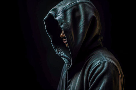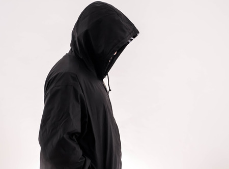 This striking image features a silhouette of a hooded hacker set against a dark backdrop, isolated on a clean white background. It embodies the essence of cybercrime, secrecy, and digital anonymity.