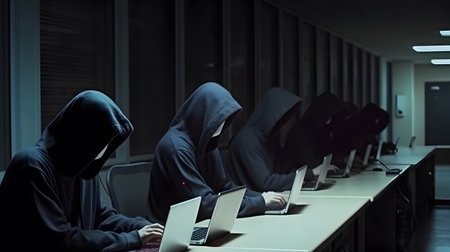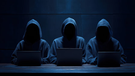 A group of faceless hackers in dark hoodies collaborated around a table, focused on their laptops in a dimly lit underground space.