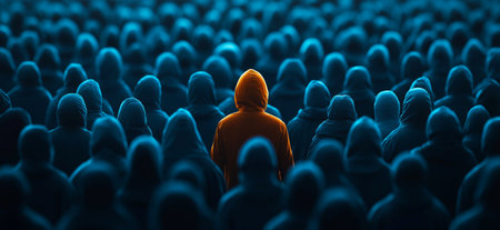 A crowd of people in hoodies is seen from behind, creating a sense of anonymity and unity in a large group.