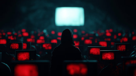 A person stands in dark room filled with retro TVs displaying red screens, creating surreal atmosphere. glowing screens contrast with shadows, evoking sense of mystery and intrigue