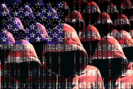 Group of hooded hackers shining through a digital american flag cybersecurity concept