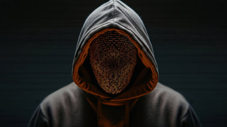Mysterious figure in dark hoodie stands against dimly lit background, with their face obscured by pattern of text, creating enigmatic and intriguing atmosphere