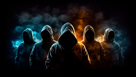 People in hoods in a room with smoke.Generative AI technology