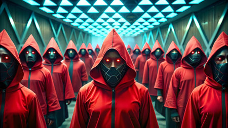 Group of people in red hooded cloak standing in a row and looking at the camera. Guard from Squid Game. Netflix show. Squid Game is a South Korean survival drama television series