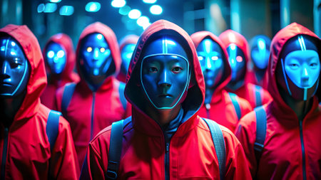 Group of robot in red and blue neon light. Futuristic artificial intelligence concept. Famous Korean Squid Game.
