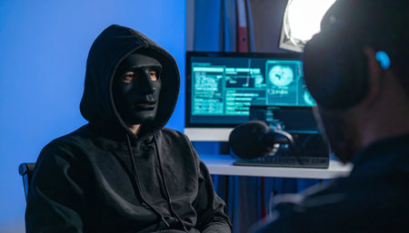 Hacker with Mask in Neon Lit Cybersecurity Room. Close-up of a masked individual in a hoodie, illuminated by a neon red and blue light, symbolizing cyber hacking and security.