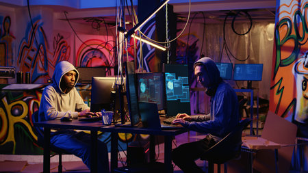 Hacker and crime partner working together and planning system breach in abandoned warehouse. African american and asian criminals checking ransomware on computer in hideout