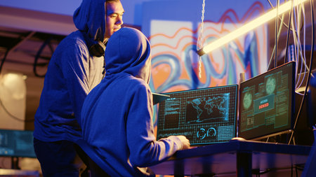 Hacker and crime partner exchange fist bump after successful cyberattack on server. Criminals making friendly gesture while breaking law and coding illegal malicious software in hideout place
