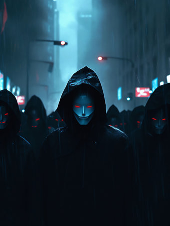A group of mysterious hooded figures wearing masks strolls through an urban setting, creating an intriguing atmosphere of anonymity and curiosity.