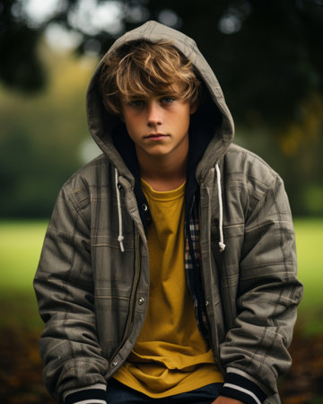 a teenager in a yellow sweatshirt looks in front of him, close-up