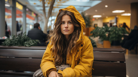 a young woman in a yellow jacket sitting on a bench