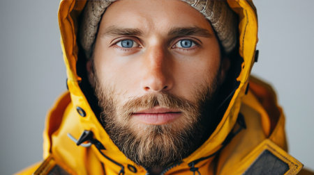 Portrait of a man in a yellow raincoat looking away.