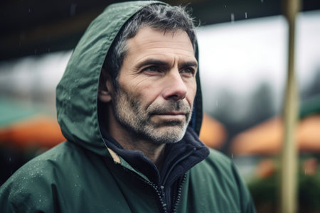 a happy portrait of a man wearing a raincoat. GENERATE AI