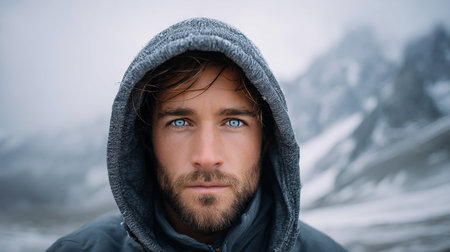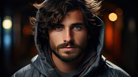 A man wearing a black hoodie and beard. He is looking at the camera. The image has a moody and mysterious feel to it