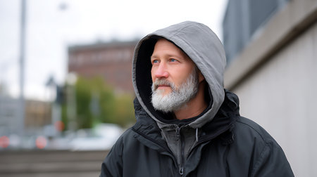 Portrait of a middle-aged man with gray beard and mustache in a black jacket on the street
