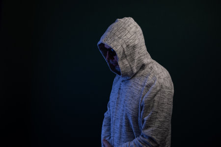 Portrait of mysterious man wearing hooded sweatshirt standing silently. Isolated on dark background.