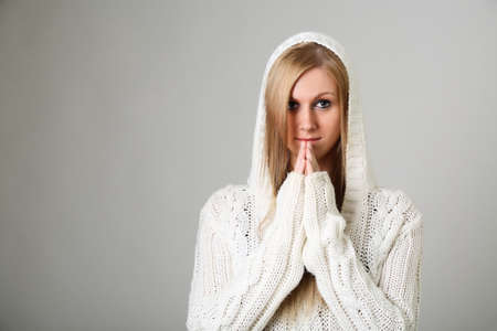 Portrait of a beautiful young blonde woman in a gray hoodie.