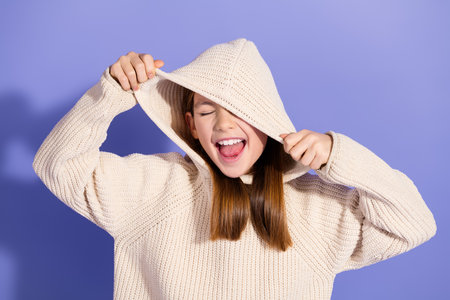 Adorable young girl posing joyfully in a fashionable hoodie against a vibrant purple background