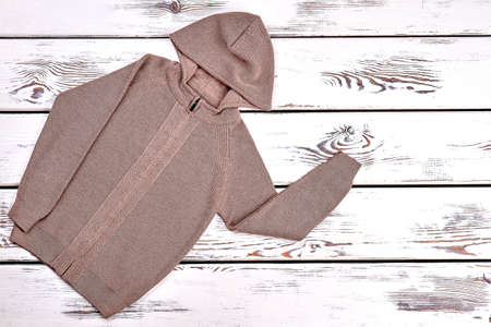 New brown hooded sweater. Children cotton cardigan with hoodie, old wooden background. Top quality of knit jacket for boys.