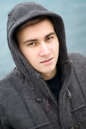 Closeup conceptual art portrait of beautiful handsome gothic young middle east brunette man with beard, wearing blue gery hoodie, outside in street looking away profile