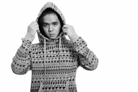 Dramatic portrait of serious hispanic teenager looking to the camera and wearing a hoodie.