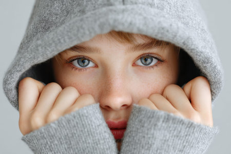 Young person with gray hoodie covering face, hands gripping sleeves, minimalistic background