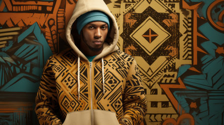 a young man wearing a hoodie stands confidently against a vibrant wall adorned with african-inspired textile patterns. the combination of light amber and turquoise creates a visually striking backdrop for this photographically detailed portrait. the artgerm style is evident in the symmetrical patterns, while the craftcore influence is reminiscent of albert joseph moore's artwork. ai generated