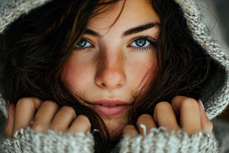 Beautiful white young woman with freckles and captivating green eyes in a cozy sweater. A close-up portrait of a woman with striking eyes and natural beauty, wrapped in a warm, textured sweater.