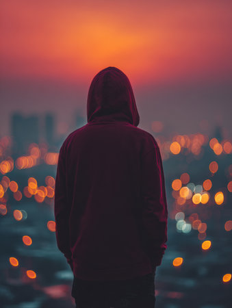 A person wearing a hooded garment stands alone, gazing at a striking orange sunset illuminating the city below, creating a serene atmosphere.