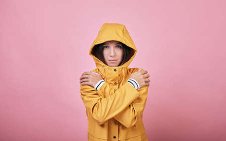 A cool charming girl with green eyes and a pretty face in a yellow raincoat with a dressed hood is frozen and trembling. Cold autumn, windy weather.