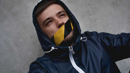 Man with tape over his mouth. The mouth is sealed with warning tape