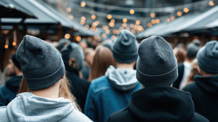 A crowd of people is captured from behind, with a shallow depth of field, highlighting multiple individuals wearing beanies. The image exhibits a muted color palette with soft focus. The composition includes overhead string lights, suggesting an outdoor or festive environment suitable for various commercial uses.
