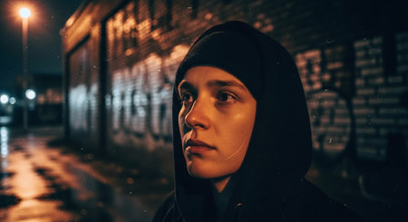 A young person with a serious expression wears a red hoodie and stands in front of a colorful graffiti wall.