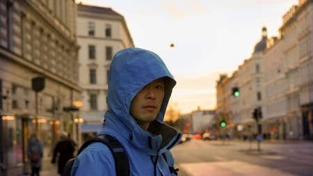 Asian man with outdoor jacket, sporty look with sunset, European architecture background