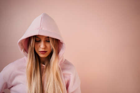Fashion studio portrait of a happy young blonde woman in hoodie posing over pink background.
