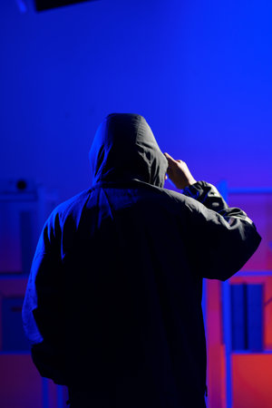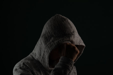 The unseen: A person in a red jacket, identity hidden, set against a dark, moody background, enhancing the sense of mystery