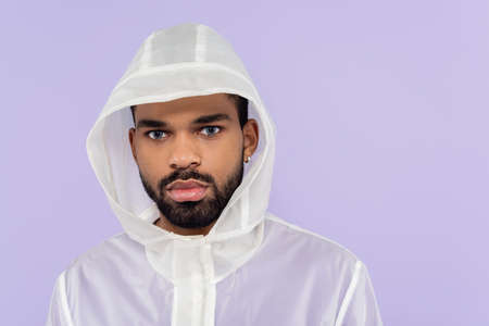 african american sportsman in stylish sportswear with hood looking at camera isolated on purple
