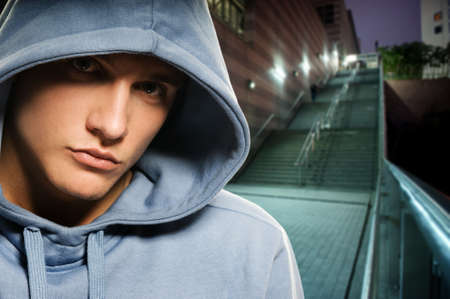 Young handsome man in hood outdoors. Portrait of hooded guy walking through night city