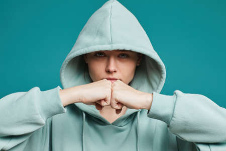 Portrait of serious determined girl fighter in hoodie joining fists together while preparing for fight