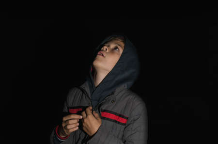 A little boy in warm clothes with a hood looks at the sky in the dark