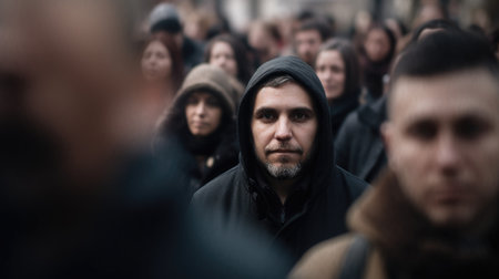 Lone Rebel - A portrait of a solitary figure highlighted amongst a sea of faces, capturing the essence of rebellion and nonconformity in youth culture.