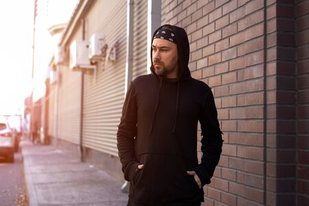 Handsome young unshaven man black hoodie and bandana stands backyard near brick walls summer day. Bearded hipster standing outdoor. Fashionable young adult caucasian guy modern urban clothes